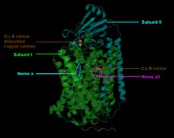 Le complexe IV de la chaîne respiratoire, également appelé cytochrome a3, est une grosse protéine membranaire intégrale possédant plusieurs groupes prosthétiques métalliques et 14 sous-unités protéiques chez les mammifères[6], dont onze sont encodées par des gènes du noyau cellulaire et trois proviennent du génome mitochondrial. Il contient deux hèmes, l'un appartenant à un cytochrome a et l'autre appartenant à un cytochrome a3, ainsi que deux centres à cation de cuivre, notés centres CuA et CuB[7].