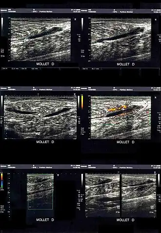 - échographie/échotomographie : « examen le plus utile et le moins cher, permet une étude des fibres musculaires, des tendons et des aponévroses. Ses limitations sont la mauvaise analyse des zones profondes, comme l’insertion proximale des ischio-jambiers, et la difficulté à détecter parfois les cicatrices »[3].