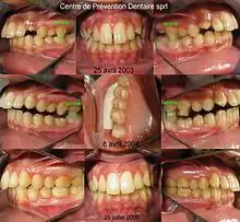 - ↑ Pour P. Planché et P. Canal : "La récidive est une constante à laquelle il faut se plier. Le taux de récidive est très variable et le plus souvent élevé - In : HAS, Rapport complet, Les critères d’aboutissement du traitement d’orthopédie dento-faciale, Recommandation pour la pratique clinique, Agence nationale d’accréditation et d’évaluation en santé (Anaes, Rapport 2003), Haute Autorité de la Santé, décembre 2003: 28"