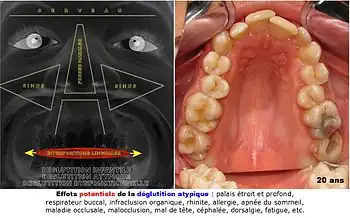 - La déglutition atypique touche 10 à 15% des adultes. Elle se caractérise par le réflexe d'étalement horizontal de la langue entre les deux arcades dentaires, des dents cliniquement trop petites, des « encombrements » dentaires (manque de place, bruxisme), des mâchoires « trop petites » (ODF : « contenant dentaire »), un palais étroit et profond, des fosses nasales étroites (stagnation des sécrétions, proliférations bactériennes), des sinus peu développés (ventilation pauvre, sinusites) et une hypoacousie (trompe d'Eustache peu perméable). Toutes ces caractéristiques forcent la patient à respirer par la bouche (respiration buccale). Les irritations des voies respiratoires sont fréquentes et diverses, voire estivales, telles amygdalite (grosses amygdales, angine, odynophagie), « refroidissements » (rhume, rhinite, pharyngite, trachéite, bronchite), allergie ou rhume des foins, sinusite, aigüe ou chronique. D'autres signes peuvent se greffer sur ce terrain déjà favorable aux agressions du milieu extérieur : acouphènes, otites, ronflements, apnées obstructives du sommeil, mort subite, etc.