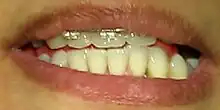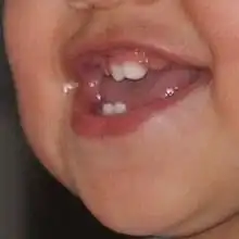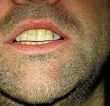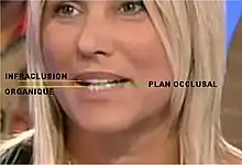 - ↑ Supraclusion incisvo-canine, ou overbite (en) : recouvrement important des incisives supérieures sur les incisives inférieures lorsque les arcades dentaires sont en intercupidation maximale volontaire (« occlusion »). L'espace libre est considérable = dents trop petites sur les arcades. Étiologie : déglutition infantile, devenue déglutition atypique chez le sujet adulte.