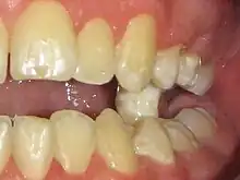 - ↑ Prise spécifique de l'articulé occlusal à l'aide de cire dentaire, à l'état semi-liquide et déposée en goutte à goutte sur l'armature métallique des futurs bridges en porcelaine ; ceci afin de ne jamais influencer la perception tactile fine des piliers naturels (proprioception desmodontale).