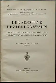 - ↑ (de) Ernst Kretschmer, Der Sensitive Beziehungswahn: Ein Beitrag zur Paranoiafrage und zur Psychiatrischen Charakterlehre, Springer, Berlin, 1918, 1116 p.