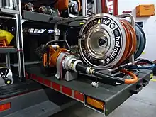 Certains camions de pompiers sont multifonctionnels, comme ici une autopompe des pompiers luxembourgeois de Contern, où l'on peut apercevoir le matériel de désincarcération au côté du matériel de lutte contre l'incendie.