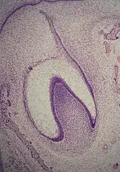 La formation d'une dent commence donc par un agrégat cellulaire, le germe dentaire[2], dérivant de l'ectoderme issu du premier arc branchial de la crête neurale[1],[3],[4]. Ce tissu d'origine ectoblastique va se transformer en un tissu mésenchymateux appelé ectomésenchyme ou mésenchyme ectodermique. Le germe dentaire est divisé en trois parties : le bourgeon dentaire (ou organe de l'émail ou encore organe adamantin), issu de l'ectoderme, la papille dentaire et le follicule dentaire, issus du mésenchyme.