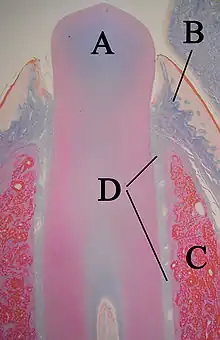 La formation de l'émail chez les mammifères non humains est presque identique à celui de l'homme. Les améloblastes et organes de l'émail, y compris la papille dentaire, fonctionnent de manière similaire[82]. Néanmoins, si les améloblastes meurent chez l'homme et la plupart des autres animaux, les rendant incapables de continuer à produire de l'émail, les rongeurs en produisent continuellement, ce qui les force à user leurs dents en rongeant divers matériaux[83]. S'ils ne peuvent pas le faire, leurs dents finissent par percer le toit de leur bouche. En outre, les incisives de rongeurs se composent de deux moitiés, connues sous le nom d'analogues de la couronne et de la racine. La moitié vestibulaire est recouverte d'émail et ressemble à une couronne, tandis que la moitié linguale est recouverte de dentine et ressemble à une racine. La racine et la couronne se développent simultanément dans les incisives des rongeurs et continuent de croître pendant toute la vie de l'animal.