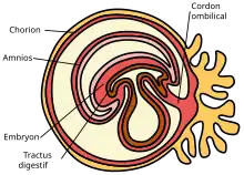 À la suite du repliement céphalocaudal et latéral de l'embryon, une partie de la cavité du sac vitellin bordée d'endoderme est incorporée dans l'embryon pour former l'intestin primitif. Dans les parties céphaliques et caudales de l’embryon, l’intestin primitif forme respectivement un tube, l’intestin antérieur et l’intestin postérieur. La partie médiane, l'intestin moyen, reste reliée temporellement au sac vitellin au moyen du canal vitellin[4]. Ces trois régions de l'embryon sont délimitées par le tronc coeliaque qui dessert l'intestin antérieur, l'artère mésentérique supérieure qui dessert l'intestin moyen et l'artère mésentérique inférieure qui dessert l'intestin postérieur.