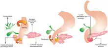 À partir du 26éme jour, à l'opposé de la plaque hépatique sur le duodénum le bourgeon pancréatique dorsal commence à ce développé qui donnera le pancréas dorsal composant la tête, le corps et la queue du pancréas. Il est suivi peu de temps après par le bourgeon pancréatique ventral situé dans le méso dorsale il donnera le pancréas ventral ainsi que le conduit cholédoque. L'endoderme pancréatique entre alors en multiplication cellulaire formant plusieurs couches entourées du mésoderme qui l'entoure. Le mésoderme interagit pendant l'ensemble de la période embryonnaire en stimulant la croissance et la différentiation du pancréas grâce à des interactions cellulaires et l'envoie de facteur de transcription incluant FGF10, ISL1 et PBX1[3]. Pendant ce développement, chez l'Homme le bourgeon pancréatique ventral et le conduit biliaire commun effectue une rotation autour du duodénum pour atteindre le méso dorsal, lors de la sixième semaine les deux bourgeons pancréatiques fusionnent pour donner le pancréas, les conduits du bourgeon du pancréas dorsal disparait et le conduit du pancréas ventral donne le canal pancréatique principal et se fixe à la papille duodénale majeure[3].