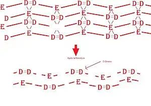 Le fibrinogène comporte trois domaines, deux latéraux appelés « D » et un central appelé « E ». Sous l'action de la thrombine, le fibrinogène se polymérise en fibrine, reliant les domaines « D » deux à deux. Le facteur XIII va solidifier la fibrine en créant des liaisons entre le domaine « E » et les domaines « D » reliés voisins. La plasmine dissocie les domaines « D » - « D » du domaine « E », les premiers formant les D-dimères[1] qui partent dans la circulation sanguine. Ceux ci peuvent être dosés en se servant d'anticorps spécifiques