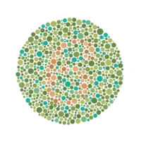- le test d’Ishihara : il s’agit d’un test composé de nombreuses planches de couleurs contenant un chiffre, d’une couleur telle que le daltonien concerné ne le percevra ni par la couleur, ni par la différence de couleur perçue ;