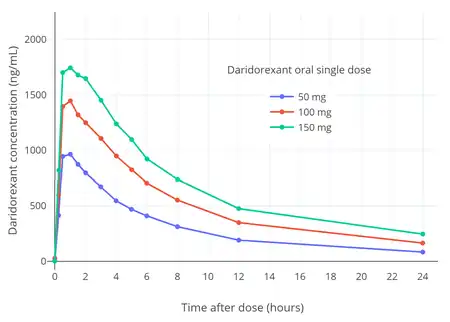Le médicament a une demi-vie d’élimination d’environ 8 heures ou de 6 à 10 heures[3]. La demi-vie du daridorexant peut être plus longue chez les personnes âgées que chez les jeunes adultes (9 à 10 heures chez les personnes âgées contre 6 heures chez les jeunes adultes)[3]. Sa demi-vie est plus courte que celle d'autres antagonistes des récepteurs de l'orexine tels que le suvorexant (12 heures) et le lemborexant (~18–55 heures). La demi-vie relativement courte du daridorexant peut permettre de réduire la sédation diurne[10]. La durée d'action du daridorexant en termes d'effets sédatifs est d'environ 8 heures avec un 50 dose en mg.