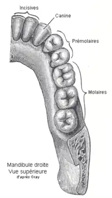 Chaque dent est constituée d'une racine dentaire qui s'implante dans une alvéole de la mandibule ou du maxillaire, et d'une couronne visible extérieurement. Les deux parties sont séparées par le col de la dent.