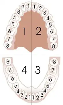 - le chiffre des dizaines est déterminé par la partie d'un quadrant imaginaire, correspondant à une hémi-arcade dentaire, dans lequel se trouve la dent. En regardant la personne en face, 1 est en haut à gauche (à la droite de la personne), 2 en haut à droite (à la gauche de la personne), 3 en bas à droite (à la gauche de la personne), 4 en bas à gauche (à la droite de la personne) ;