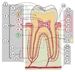 Détail d'une molaire humaine. 1. Dent. 2. Émail. 3. Dentine. 4. Pulpe dentaire (5. pulpe coronale, 6. pulpe radiculaire). 7. Cément. 8. Couronne (9. cuspide, 10. sillon). 11. Collet. 12. Racine (13. furcation, 14. apex radiculaire, 15. foramen apical). 16. Sulcus. 17. Parodonte. 18. Gencive (19. libre, 20. marginale, 21. attachée). 22. Ligament parodontal. 23. Os alvéolaire. 24. Nerfs et vaisseaux (25. dentaire, 26. parodontaux, 27. nerf alvéolaire).