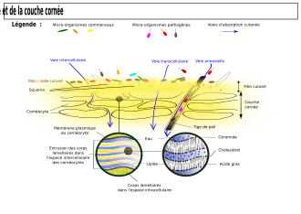 Représentation schématique d'une coupe transversale de peau, avec le film et le microbiote cutané, ainsi que la couche cornée à partir de laquelle s'effectue une desquamation en squames qui correspondent au détachement des cornéocytes.