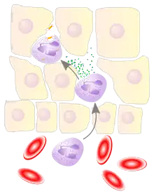 Une fois entrés dans les tissus environnants les leucocytes vont provoquer l'inflammation de ce tissu.