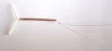 Le retrait se fait en tirant sur les deux fils de retrait qui sont normalement présents dans le vagin, en sortie de l'endocol. La rupture des fils lors du retrait peut être due à un enfoncement d'une des branches dans le myomètre. Une échographie pelvienne peut permettre un contrôle, avec toutefois des faux-positifs de l'ordre de 70 %[26]. En cas d'absence de fils, l'échographie pelvienne reste l'indication de première intention, pour vérifier la présence intra-utérine du DIU. Il est possible alors de tenter de récupérer les fils à l'aide d'une cytobrosse. Si la manœuvre échoue, certains gynécologues français préconisent l'utilisation de diverses pinces, avec contrôle échographique[27] ou en cas d'échec à l'ablation avec contrôle hystéroscopique[26] et utilisation d'une injection préalable de lidocaïne en raison du caractère douloureux des manipulations[27]. Dans d'autres pays, une hystéroscopie opératoire avec anesthésie générale est envisagée en dernier ressort[28].