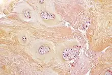 Photomicrographie montrant un fragment d'un disque intervertébral attestant d'une dégénérescence du fibrocartilage, avec perte de chondrocytes et chondroplastes, caractéristique des maladies dégénératives du disque.
