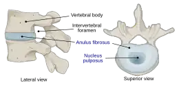 Les disques intervertébraux sont constitués d'un anneau fibreux externe, l'annulus fibrosus, qui entoure une substance gélatineuse interne, le nucleus pulposus[1].