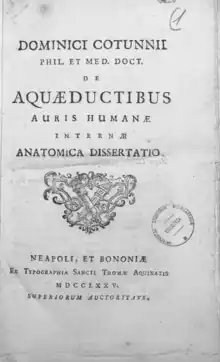 - ↑ Tous les ouvrages qui avaient parus pendant la vie de Cotugno ont été réunis et réimprimes en 2 vol. in-8° à Naples en 1826 ; et le savant professeur Pietro Ruggiero a publié ses œuvres posthumes en 1 volume in-8°, Naples 1832. Par un testament mystique du 18 août 1820, Cotugno divisa ses biens en trois parties égales, dont il laissa une à l’hôpital des Incurables, la seconde à ses parents, et la troisième à Ippolita Ruffo, duchesse de Bagnara qu‘il avait épousée en 1794, et qui ne lui donna point d’enfants.