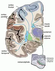 Les neurones dopaminergiques de la pars compacta de la substance noire projettent majoritairement dans la partie supérieure du striatum, constituée du noyau caudé et du putamen. La voie nigrostriée représente 80 % des neurones dopaminergiques centraux[9]. Ce réseau constitue un système modulateur des aires corticales motrices et intervient dans le phénomène de contrôle des fonctions motrices[13]. La maladie de Parkinson est une maladie dont la cause est la dégénérescence du groupe de neurones produisant la dopamine dans la substance noire. L'administration du précurseur L-DOPA qui, contrairement à la dopamine, peut traverser la barrière hémato-encéphalique, ralentit la progression de la maladie, car le cerveau transforme cette substance en dopamine.