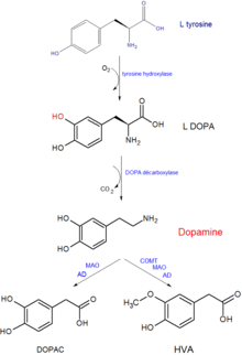 La dopamine est synthétisée dans les neurones à partir de la tyrosine d'origine circulante. La réaction est assurée par deux enzymes : la tyrosine hydroxylase (TH), une enzyme limitante contrôlant la production de L-DOPA, puis par la DOPA-décarboxylase (DDC)[9] assurant la décarboxylation de cette dernière pour donner la dopamine.