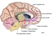 Les projections dopaminergiques qui trouvent leur origine dans l'aire tegmentaire ventrale (ATV) (également appelée aire tegmentale ventrale) du mésencéphale ont pour cible la région ventrale du striatum, appelée également noyau accumbens ou nucleus accumbens, la stria terminalis, les tubercules olfactifs, le septum, l'amygdale, l'hippocampe. Ce réseau neuronal, qui représente le système de récompense / renforcement participe au contrôle des processus motivationnels et de récompense et est impliqué dans les phénomènes de dépendance et d'addiction[14]. Par exemple, la cocaïne provoque une augmentation de dopamine dans les fentes synaptiques au niveau du noyau accumbens en inversant le fonctionnement du système de recapture de la dopamine. La nicotine provoque aussi une augmentation de la transmission dopaminergique. Toutes les substances psychoactives (cocaïne, amphétamine, alcool, opiacés) provoquent une augmentation des taux extracellulaires de dopamine dans le noyau accumbens (Di Chiara et al[15] 1988). La dopamine est aussi impliquée dans la zone cérébrale non incluse dans la barrière hémato-encéphalique responsable du réflexe de vomissement, ce qui explique l'effet antiémétique des neuroleptiques (antagonistes dopaminergiques).