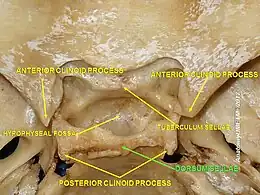 Latéralement à ses angles supérieurs se trouvent les processus clinoïdes postérieurs, de taille très variable. Ce sont les points d'insertion de la grande circonférence de la tente du cervelet.