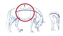 Le dos creusé est une pathologie révélatrice d'une musculature insuffisante, entrainant des douleurs et des difficultés de déplacement, et qui peut facilement être vue par le fait que les vertèbres sont saillantes[6]. Les chevaux qui en sont atteints sont dits « ensellés ». Le creusement du dos se produit généralement chez les chevaux âgés et plus fréquemment chez ceux qui ont le dos long ou ne travaillent pas assez.