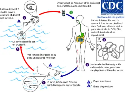La larve du parasite est présente dans des crustacés microscopiques, les Cyclops, vivant dans l’eau stagnante. La contamination humaine se fait par ingestion d'eau contaminée. Devenu adulte, le ver filiforme se déplace dans les tissus sous-cutanés vers les extrémités inférieures du corps. Il perce la peau pour pondre ses embryons au contact de l'eau.