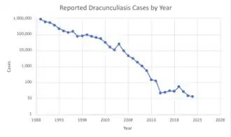 En 2021, 15 cas humains de dracunculose ont été notifiés dans 4 pays : Tchad (7 cas), Soudan du Sud (4 cas), Mali (2 cas), Éthiopie (1 cas)[24]. Un système de récompenses en espèces pour signaler les derniers cas a été mis en place. La phase finale d'éradication repose aussi sur la microplanification (ciblage des foyers restants), la lutte antivectorielle (traitement des eaux), le confinement des cas, la mise en laisse des chiens etc… dans toutes les zones à risque[24].