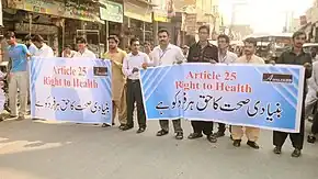 Gruskin et al. ajoutent que la nature interdépendante des droits exprimés dans la Déclaration universelle établit une « responsabilité [qui] va au-delà de la fourniture de services de santé essentiels pour s'attaquer aux déterminants de la santé tels que la fourniture d'une éducation adéquate, d'un logement, d'une alimentation et de conditions de travail favorables », déclarant en outre que ces dispositions « sont des droits de l'homme en soi et sont nécessaires à la santé »[6]. Il inclut le droit à la protection de la santé au travail[7] (qui inclut la santé mentale au travail)[8].