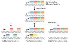 - subfonctionnalisation : si le gène originel avait deux "fonctions", l'un des deux gènes dupliqués peut perdre l'une des fonctions, et l'autre gène perdre la fonction complémentaire. Ainsi l'organisme est-il capable d'assurer les deux fonctions, mais elles sont alors assurées par deux protéines différentes. Cette subfonctionnalisation peut être sélectionnée, notamment si les deux fonctions présentent une certaine incompatibilité (expression dans des tissus différents, par exemple) ;