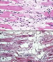 - l'infiltration fibro-adipeuse implique le remplacement des myocytes par du tissu fibro-adipeux. Il existe une infiltration inflammatoire (principalement de lymphocytes T). L'atrophie du myocarde est liée aux lésions et à l'apoptose. Ceci conduit à un amincissement de la paroi libre du ventricule droit.
