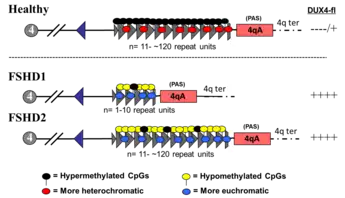 - FSHD1 : pour 95 % des patients, la maladie est due à une réduction (délétion) de la zone D4Z4 au bout du chromosome 4 sur le bras long en 4q35. Chez les personnes non atteintes, il y a plus de 11 répétitions D4Z4 dans cette zone. Chez les patients FSH, il y a moins de 10 répétitions ; et plus le nombre de répétitions est faible, plus les symptômes sont sévères[6]. La technique de peignage moléculaire permet de faire le diagnostic de cette anomalie de façon fiable[25] ;