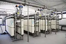 L'osmose inverse est utilisée pour la production d'eau déminéralisée depuis plus de 30 ans[9]. En osmose inverse, l'eau est transportée à travers une membrane sous haute pression, laissant un produit qui se compose principalement d'eau et d'un concentré contenant la plupart des autres composants tels que les minéraux et les résidus indésirables[11]. De nombreux contaminants, notamment le fer, le manganèse, l'ammonium, les traces de pesticides et de médicaments, les micropolluants organiques et les particules radioactives peuvent être éliminés par osmose inverse uniquement[3] . Cette efficacité a fait de l'osmose inverse la principale méthode de purification de l'eau, souvent utilisée en combinaison avec d'autres méthodes, comme traitement final. Un inconvénient de l'osmose inverse est que l'élimination de la plupart des minéraux de l'eau peut avoir des effets négatifs sur son goût. Des minéraux sont parfois ajoutés à l'eau potable qui a déjà été filtrée pour améliorer son goût.