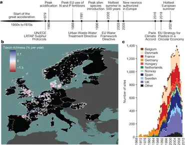 Une étude (2013) intitulée La reconstitution de la biodiversité européenne des eaux douces s’est arrêtée s'est basée sur 1 816 séries chronologiques de suivi de communautés d'invertébrés d'eau douce (bioindicatrices), collectées dans 22 pays européens de 1968 à 2020[9]. Elle a montré qu'il y a eu durant 20 ans, de 1990 à 2010, en Europe, une période de début d'amélioration (restauration écologique)[15] : richesse taxonomique se restaurant lentement : + 0,73 %/an ; richesse fonctionnelle augmentant de 2,4 %/an et abondance d'organismes s'améliorant de 1,17 % par an des années 1990 à 2010. Cependant, depuis 2010, on assiste à une nouvelle régression ou stabilisation (pour des raisons mal comprises, probablement notamment liées à de nouvelles pressions anthropiques, (incluant le réchauffement et de nouveaux polluants). Les auteurs notent que la biodiversité stagne ou se dégrade surtout dans les zones qui se réchauffent le plus[9]. Le passage de tendances essentiellement positives en matière de richesse fonctionnelle à la fin des années 1990 et au début des années 2000, à des tendances proches de zéro à partir de 2012 environ (illustration ci-contre)[9].