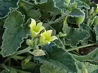 Les feuilles possèdent un long pétiole de 5 à 15 cm, et un limbe ovale-oblong ou hasté, de 8–20 cm de long sur 6–15 cm de large, scabre, dessous blanc pubescent, dessus blanc soyeux, bord sinueux ou légèrement divisé, apex légèrement obtus ; sinus semi-circulaire, parfois tronqué.