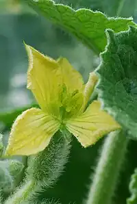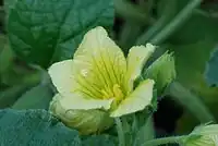 Espèce monoïque, avec des fleurs mâles et femelles sur le même pied. Les fleurs sont jaunes typiques des cucurbitacées, de 2 centimètres de diamètre, avec 5 pétales soudés. Les fleurs mâles poussent en grappe de 1-2 à 8 fleurs, avec un pédoncule densément pubescent et soyeux jaune-brun. Les fleurs femelles, solitaires, sont au bout d’un pédoncule d'abord dressé puis fortement recourbé à l’apex de sorte que le fruit mûr soit pendant.