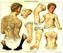 Lorsque l'affection est de courte durée, des cloques peuvent être observées. Si elle devient chronique, la peau peut s'épaissir[2]. La zone de la peau affectée peut varier d'une petite région au corps entier[2],[3].