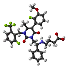 L'elagolix est un médicament utilisé comme inhibiteur de l'hormone de libération des gonadotrophines hypophysaires, donné par voie orale.