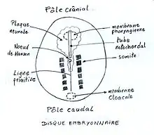 L'apparition de la ligne primitive définit non seulement la symétrie bilatérale du disque, mais également l'orientation caudo-crâniale de son axe. Le « nœud de Hensen », une dépression située vers le milieu de l'axe, termine la ligne primitive.