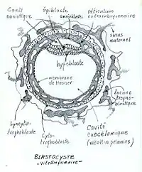 Au pôle apical du blastocyste se forme un amas de cellules internes que l'on appelle « embryoblaste », « bouton embryonnaire » ou « masse cellulaire interne » (MCI). C'est là que commence la genèse de l'embryon. La fonction nourricière des cellules périphériques du blastocyste se précise. Elles constituent le trophoblaste qui se scindera en syncytiotrophoblaste (cytoplasme multicellulaire) à l'extérieur, et en cytotrophoblaste à l'intérieur.
