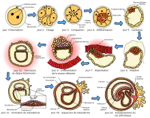 L'implantation de l'œuf dans l'endomètre se fait par les cellules du trophoblaste (partie interne de la zone pellucide désormais éclose), en regard du bouton embryonnaire. L'œuf s'implante dans le fond utérin, durant une fenêtre d'implantation comprise entre le 6e et le 10e jour de développement (20e-24e jour d'aménorrhée).