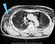 L'emphysème sous-cutané est caractérisé par la diffusion sous la peau d'air ou de gaz divers. Il se produit lorsque du gaz ou de l'air circule sous la peau. Le terme "sous-cutané" désigne le tissu situé sous la peau, et l'emphysème désigne l'air emprisonné. Comme l'air provient généralement de la cavité thoracique, l'emphysème sous-cutané se produit généralement sur la poitrine, le cou et le visage, où il peut se déplacer de la cavité thoracique le long du fascia[1].