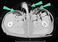 Dans une pneumonectomie, dans laquelle un poumon entier est retiré, le moignon bronchique restant peut laisser fuir de l'air, une condition rare mais très grave qui conduit à un emphysème sous-cutané progressif. [8] L'air peut s'échapper de l'espace pleural par une incision pratiquée pour une thoracotomie afin de provoquer un emphysème sous-cutané. [8] À de rares occasions, le cas peut résulter d'une chirurgie dentaire, généralement due à l'utilisation d'outils à grande vitesse entraînés par de l'air. [24] Ces cas se traduisent généralement par un gonflement indolore du visage et du cou, avec un début immédiat, le crépitement typique de l'emphysème sous-cutané, et souvent avec de l'air sous-cutané visible aux rayons X. [24]
