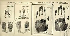 S'intéressant surtout à l'anthropologie, Francis Galton se penche à partir de 1888, à l'occasion d'une conférence qu'il est amené à faire à la Royal Society à propos de l'identification des individus et, en particulier, au sujet de la méthode Bertillon[14], sur l'étude des dermatoglyphes et publie en 1892 un ouvrage, Finger Prints (Empreintes digitales)[15], dans lequel il établit l'unicité et la permanence de ces figures cutanées. Il conçoit un système de classification détaillé et estime alors à 1 sur 64 milliards la probabilité que deux individus puissent laisser les mêmes traces. C'est à la suite des travaux de Galton qu'on redécouvre l'utilisation des empreintes digitales comme moyen d'identification.