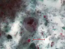Cette mise en évidence, le plus souvent par un examen parasitologique des selles, devra être demandée à des biologistes confirmés par l'expérience[3].