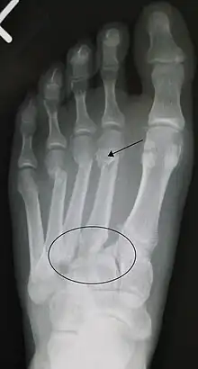 - ↑ SF. Hatem, « Imaging of Lisfranc Injury and Midfoot Sprain », Radiologic Clinics of North America, vol. 46, no 6, , p. 1045–1060 (PMID 19038612, DOI 10.1016/j.rcl.2008.09.003)