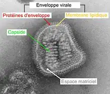 On soupçonnait alors que la fraction de lipides pourrait être corrélée avec la structure d'une membrane. L'existence de membranes en double couche de lipides avait été montrée dans les cellules par les travaux de Gorter et Grendel dès 1925[9], et il était tentant de supposer une structure analogue chez les virus contenant des lipides. La preuve en a été apportée de façon décisive par le fait que la composition des lipides des virus correspondait à celle des cellules-hôtes dans lesquelles les virus avaient été cultivés[10]. La première indication d'une enveloppe virale sur les images de microscope électronique peut être retracée ultérieurement dans une étude de Coriell en 1950. Il a isolé des virus d'herpès simplex à partir de vésicules d'herpès. Il y observa une forme curieuse, ronde, mais évidée au centre, qu'il décrivit comme « en forme de doughnut (beignet) »[11]. Aujourd'hui, on décrit cette forme typique du virus de l'herpès comme « en œuf sur le plat ». Ceci se réfère à une capside icosaédrique à l’intérieur, entourée d'une enveloppe virale très épaisse. Ce n'est qu'en 1959, quand des produits de contraste à base de sels d'uranium ont été mis au point[12] que la structure des virus s'est montrée beaucoup plus différenciée, si bien que l'on pouvait distinguer l'enveloppe virale. Aujourd'hui encore, ce contraste négatif est la méthode la plus importante pour l'examen des virus au microscope électronique.